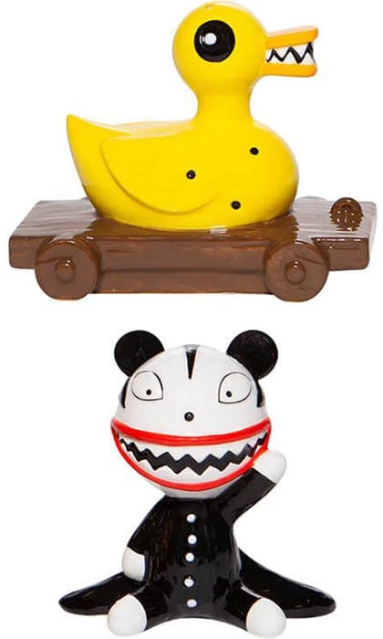 From The Nightmare Before Christmas comes this Scary Teddy and Killer Duck salt and pepper shaker set. Crafted from dolomite, these two companions are sure to make a spooky statement during mealtime!