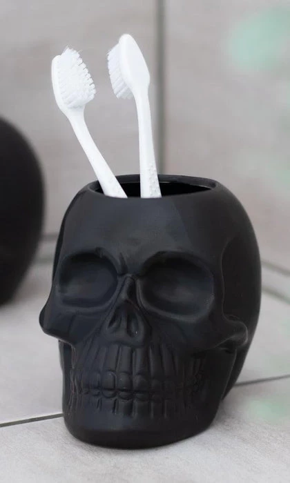 This black skull toothbrush holder is a unique piece to finish off a gothic sink space. Also perfect for holding pens, makeup brushes and more.