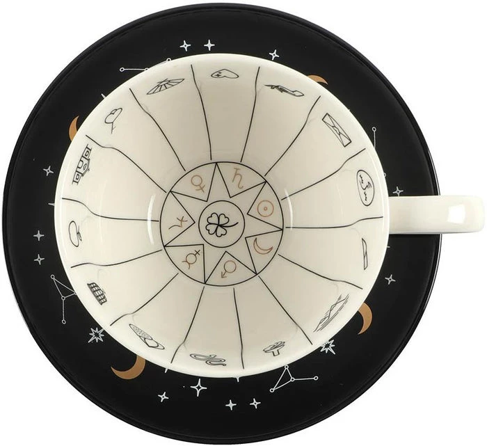A stunning and unique tea cup to be used for reading tea leaves. Features a variety of fortune telling and astrological symbols accented by gold foil, a contrasting black saucer, and mystical ‘Mysterious things I see when telling fortunes in tea’ text. Truly a piece to be treasured.Β