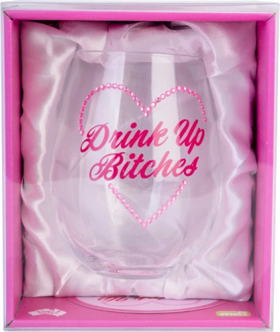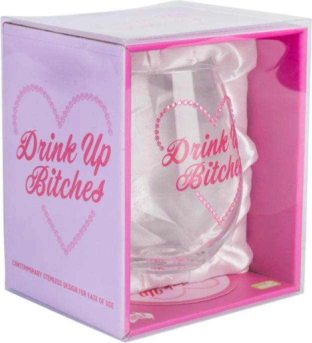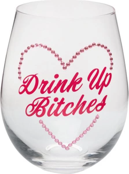 Hand-blown stemless glass featuring a heart made from pink diamantes with “Drink Up Bitches” cursive text.ย