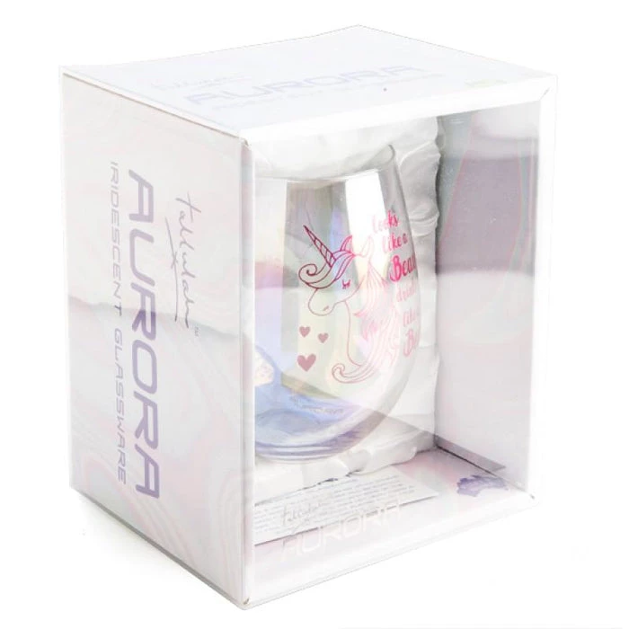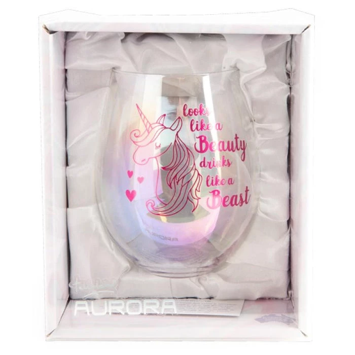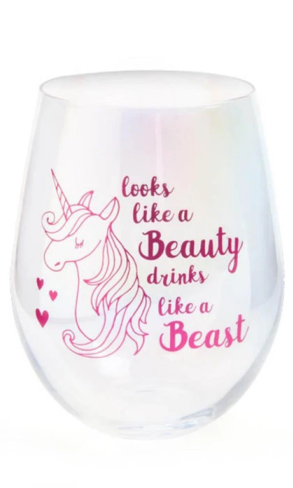 This hand blown and finished drinking glass features a dynamic iridescent sheen, with a dazzling decal in metallic pink. Features a Unicorn illustration with the text, “Looks like a beauty, drinks like a beast”.