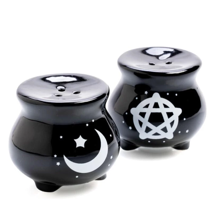 Shakers feature different designs (pentacle & crescent moon) to easily tell them apart