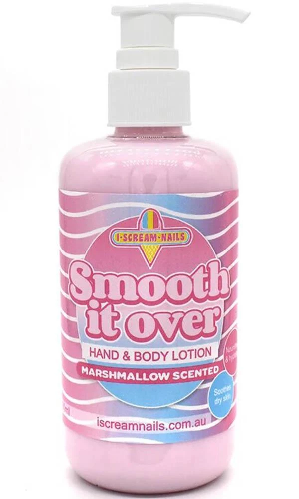 Marshmallow scented. Smooth it Over Hand and Body Lotion is an everyday, all over hand and body lotion. This nourishing formula helps hydrate and replenish dry skin. I Scream Nails formula is neither oily nor sticky and will leave your hands and skin feeling silky smooth with a radiant glow in a matter of moments.