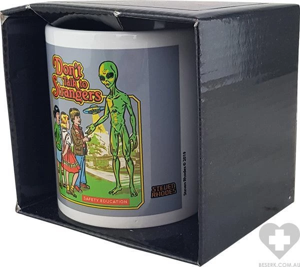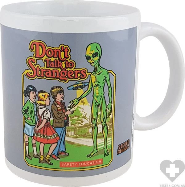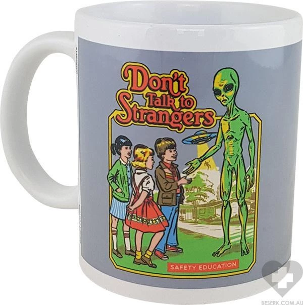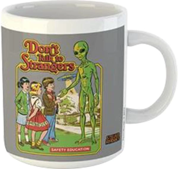 Ceramic mug with printed art of children about to shake hands with an Alien… Now who’s a stranger?